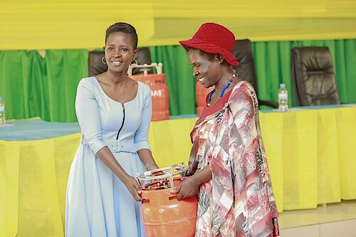 The Vice Mayor of the city of Kigali in charge of social affairs issuing gas cylinders to a beneficiary.